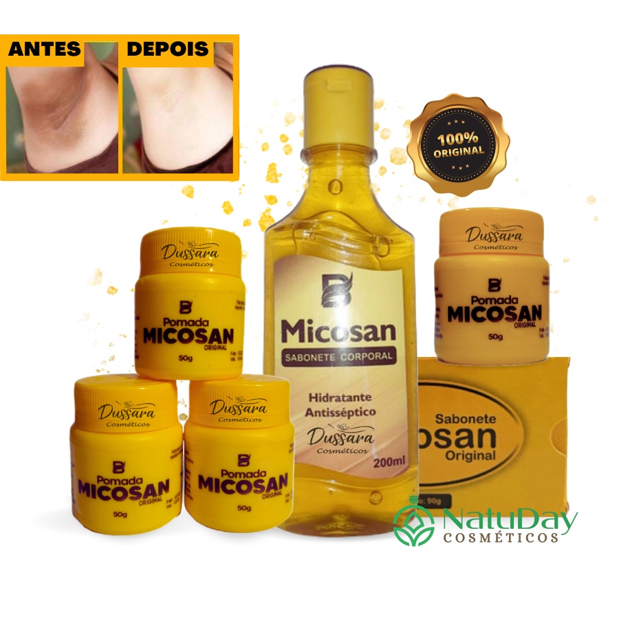 Micosan pomada 6 unidades 1 sabonete barra e 1 sabonete líquido kit clareador de manchas escuras