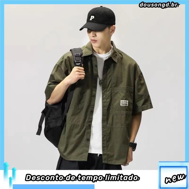 Camisa de Trabalho Estilo Japonês Camisa de Manga Meio Manga Homens Summer Loose Half-Sleeved American Style Street Wear Ruffian Camisa Bonita Twill Workwear