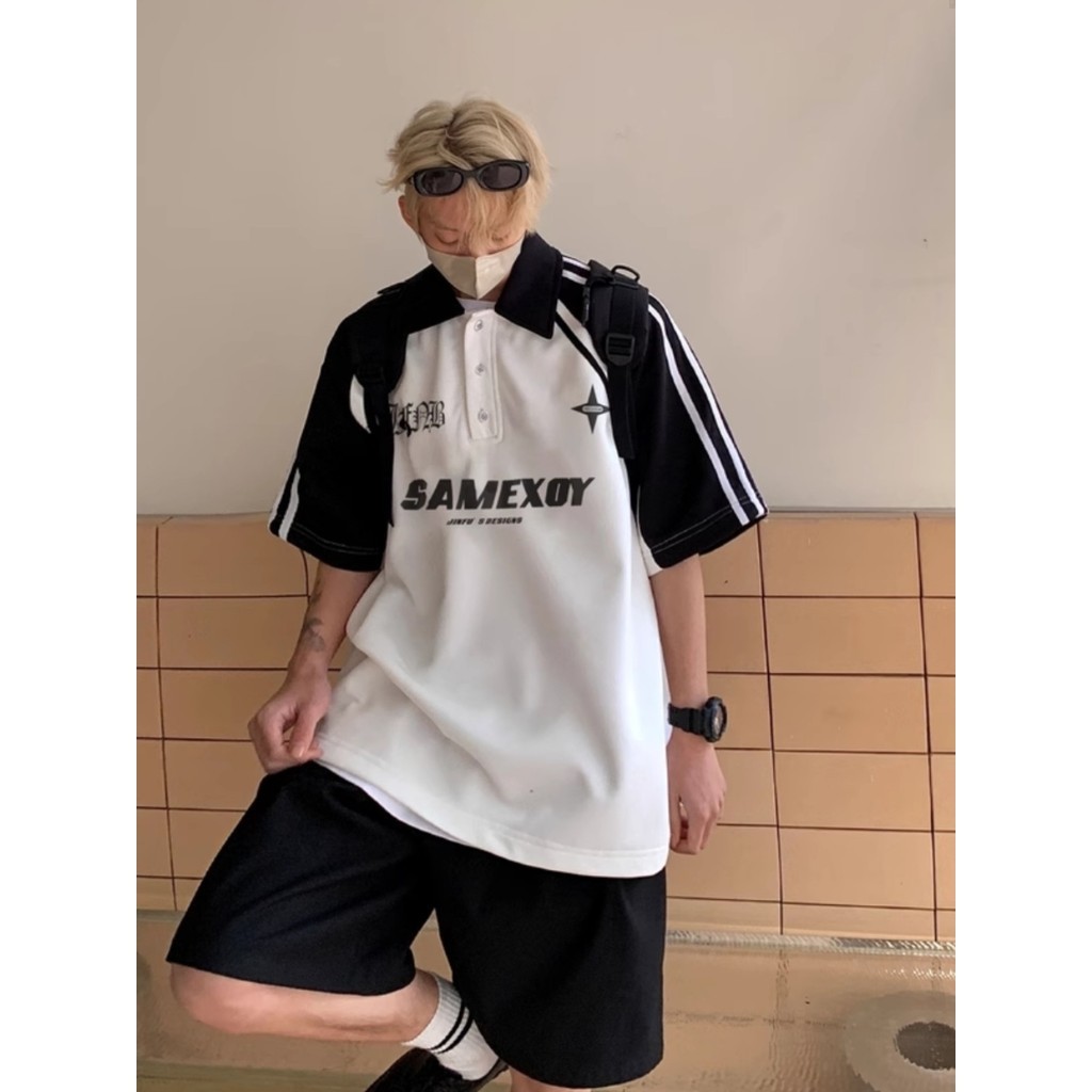 Pólo De Moda Coreano Estilo Polo Manga Curta Camisa Masculina Impressão Top Americano Retro Casal Unisexo Preppy Loose Collar Camiseta Preto Branco