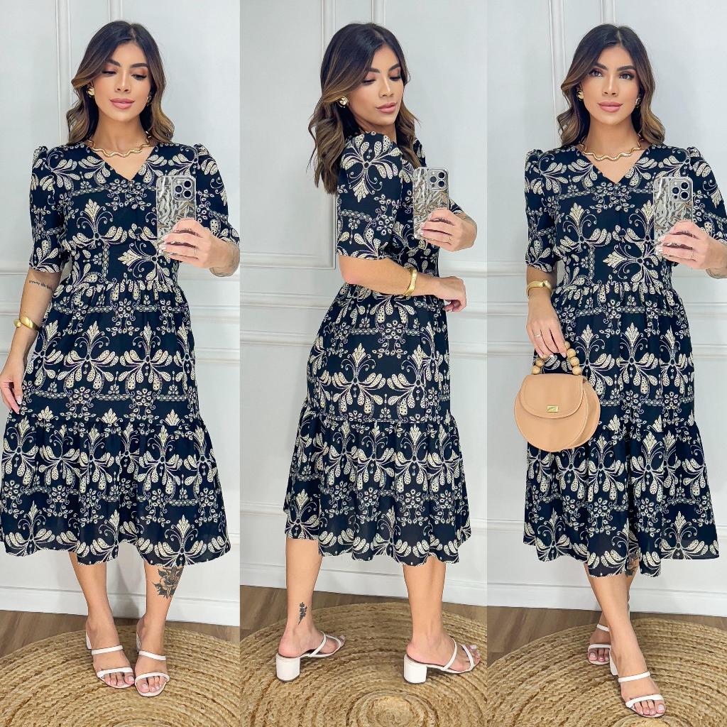 Vestido Feminino Midi com Manga Curta Botões na Frente e Elastex nas Costas - Moda Elegante