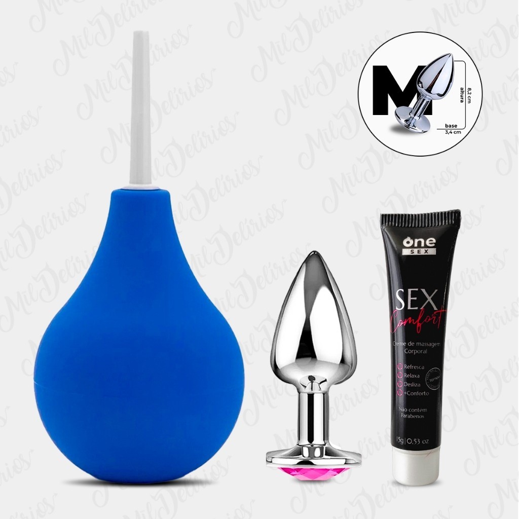 Kit Plug Anal Tamanho M Médio + Ducha Higiênica Anal 200ml + Gel Lubrificante Anal Sex Comfort