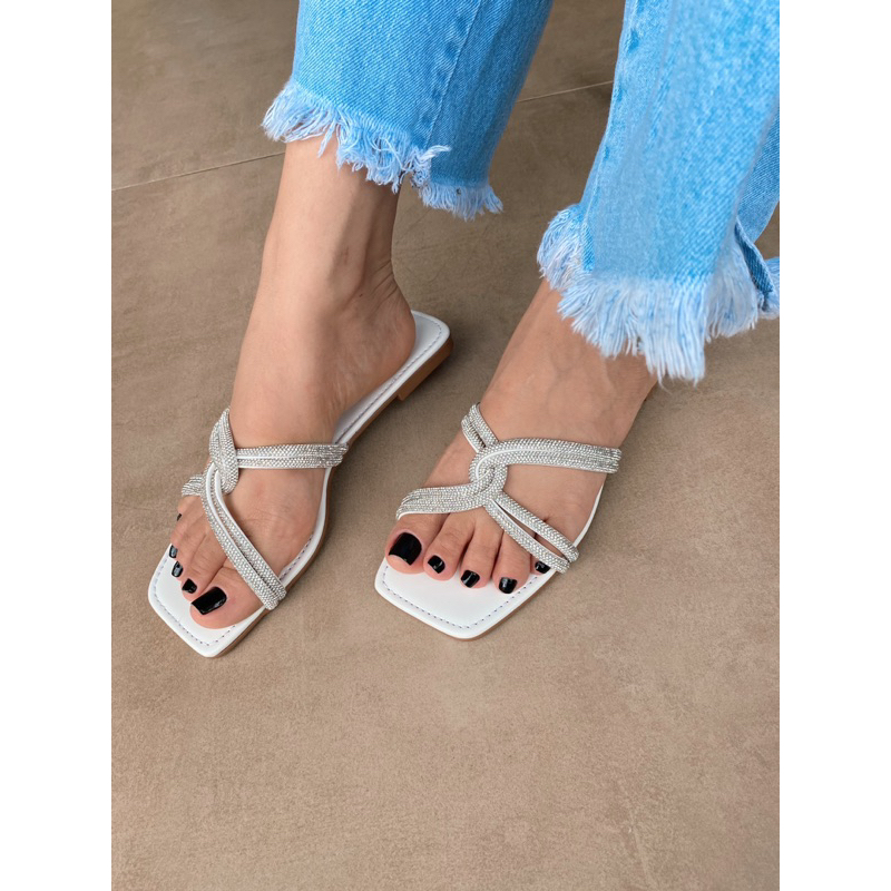 Sandália Feminina Rasteirinha Branca com Strass Brilho Luxo Rasteira Confortável RF003 Dia das Mães