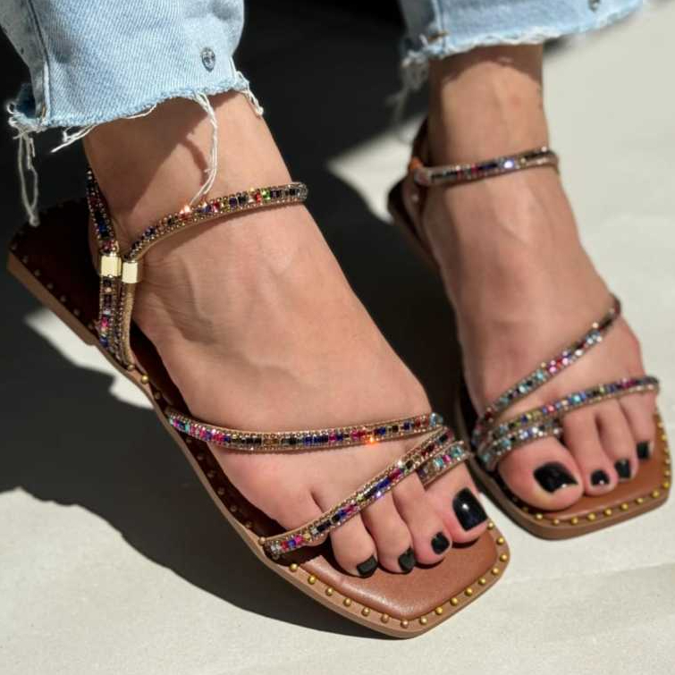 Rasteirinha Feminina Papete Strass Colorido Sandália Com Regulador Rasteira