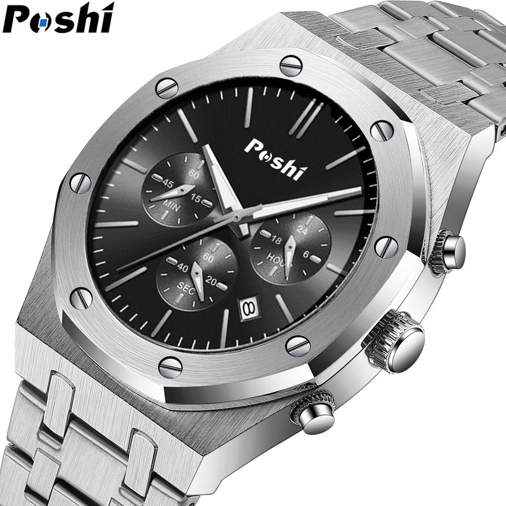 Relógio Esportivo Multifuncional Original POSHI Top Brand Men's Fashion Chronograph Cronógrafo à prova d' água Luminoso de Aço Inoxidável