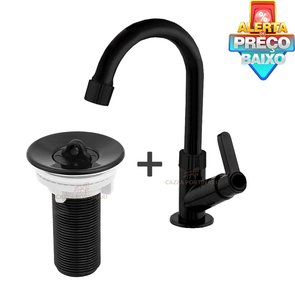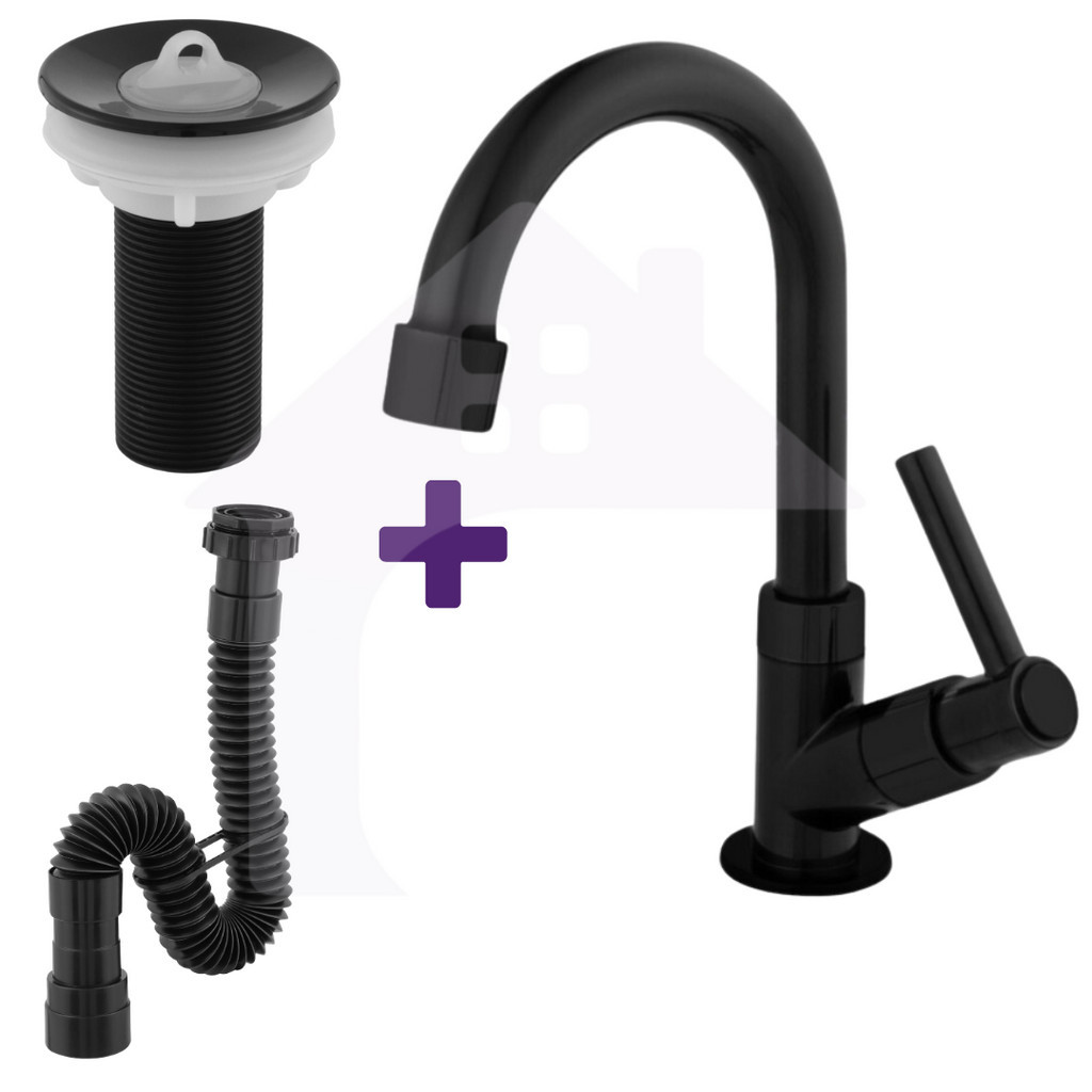 Kit Para Cuba Lavatório Torneira Pia de Banheiro Lavabo Preta ABS + Valvula 7/8 + Sifão