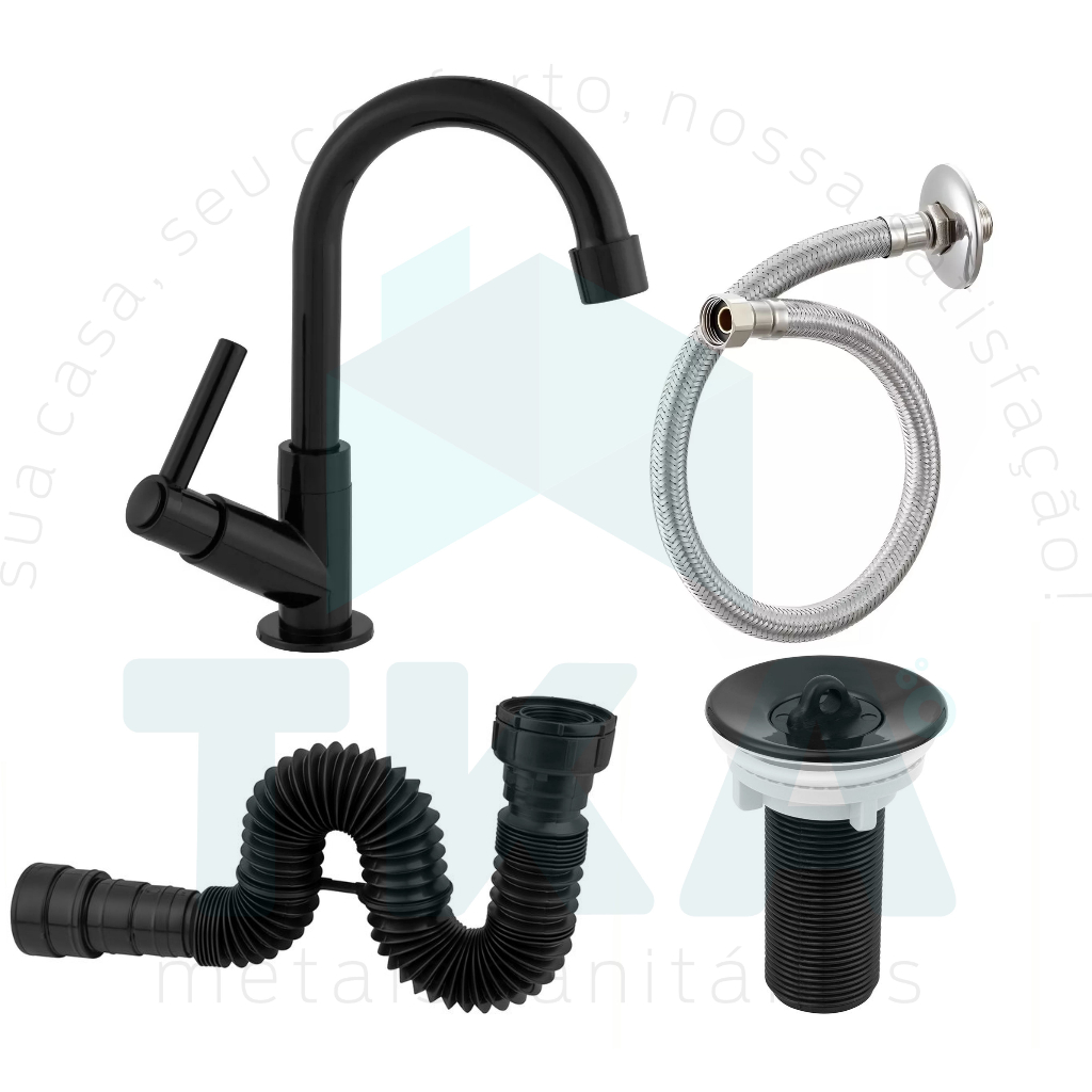 Kit Para Cuba Lavatório Torneira Pia de Banheiro Preta ABS + Válvula 7/8 + Sifão + Engate Flexível Trançado 40cm