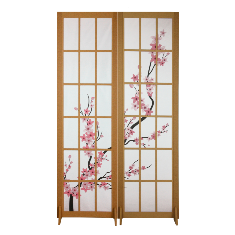 2 Biombo Inteiro Oriental Com Pé Separador De Ambiente Japonês Folha Divisória Painel Divisor Chinês Asiático Flor Sakura Cerejeira Madeira Mdf Tecido