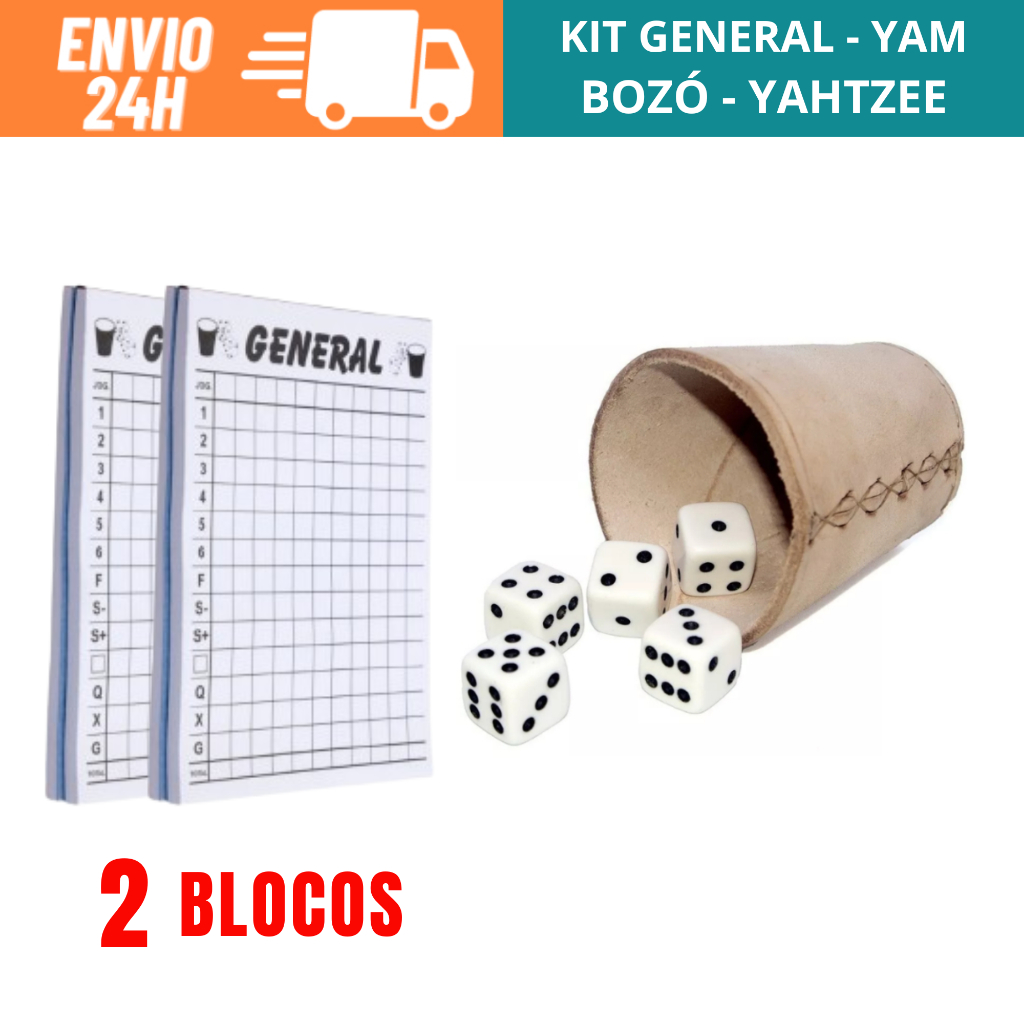 Kit Jogo General Com 1 Copo De Couro, 6 Dados e 2 Blocos Para Anotações
