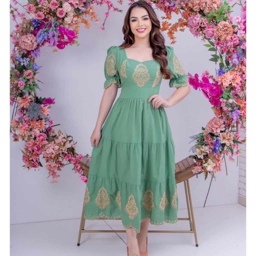 Vestido midi luxo lese bordado algodão manga curto 0490
