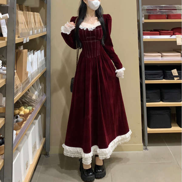 vestido longo feminino luxo vestido longo formatura brilho Roupão de Ano Novo, luxo retrô, vestido vermelho, outono e inverno feminino, costura de renda plus size, temperamento elegante, vestido princesa