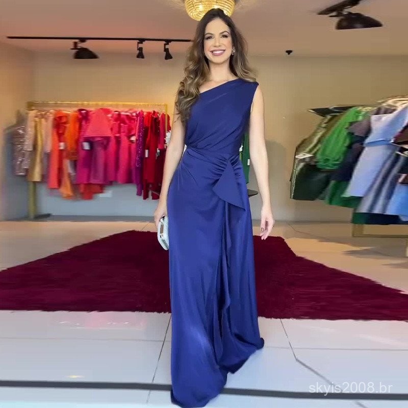 Verão Europeu E Americano Roupas Femininas Cor Sólida Babados Sem Costas Slim Fit Vestido Longo Banquete Festa De Ombro Inclinado