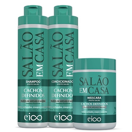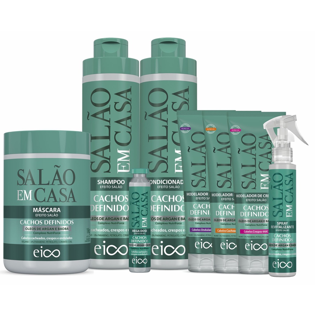 Eico Salão Em Casa Cachos Definidos Shampoo e Condicionador 800ml + Máscara Hidratação 1kg + Modelador + Spray Leave-in