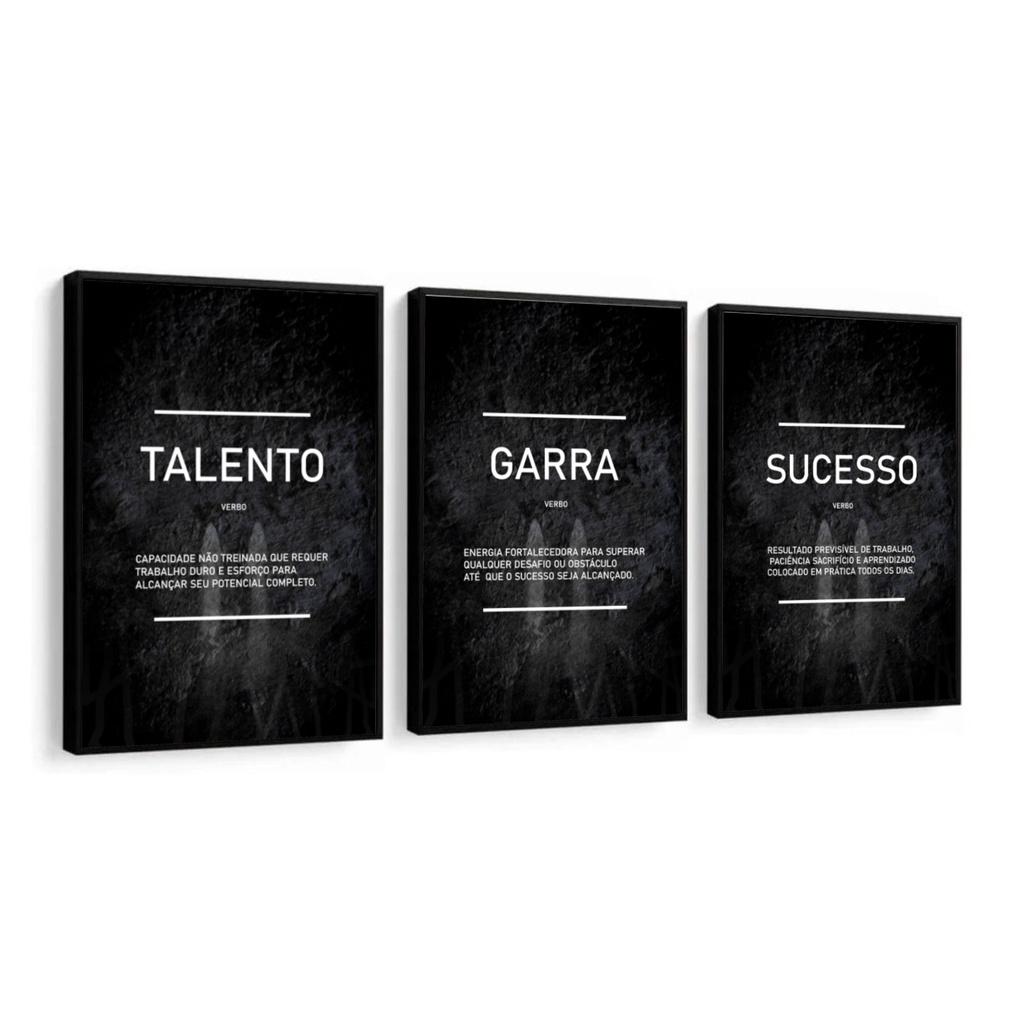 Kit 3 Quadros Decorativos Frases Motivacionais Talento Garra Sucesso Para Escritório Sala Casa Com Moldura e Vidro
