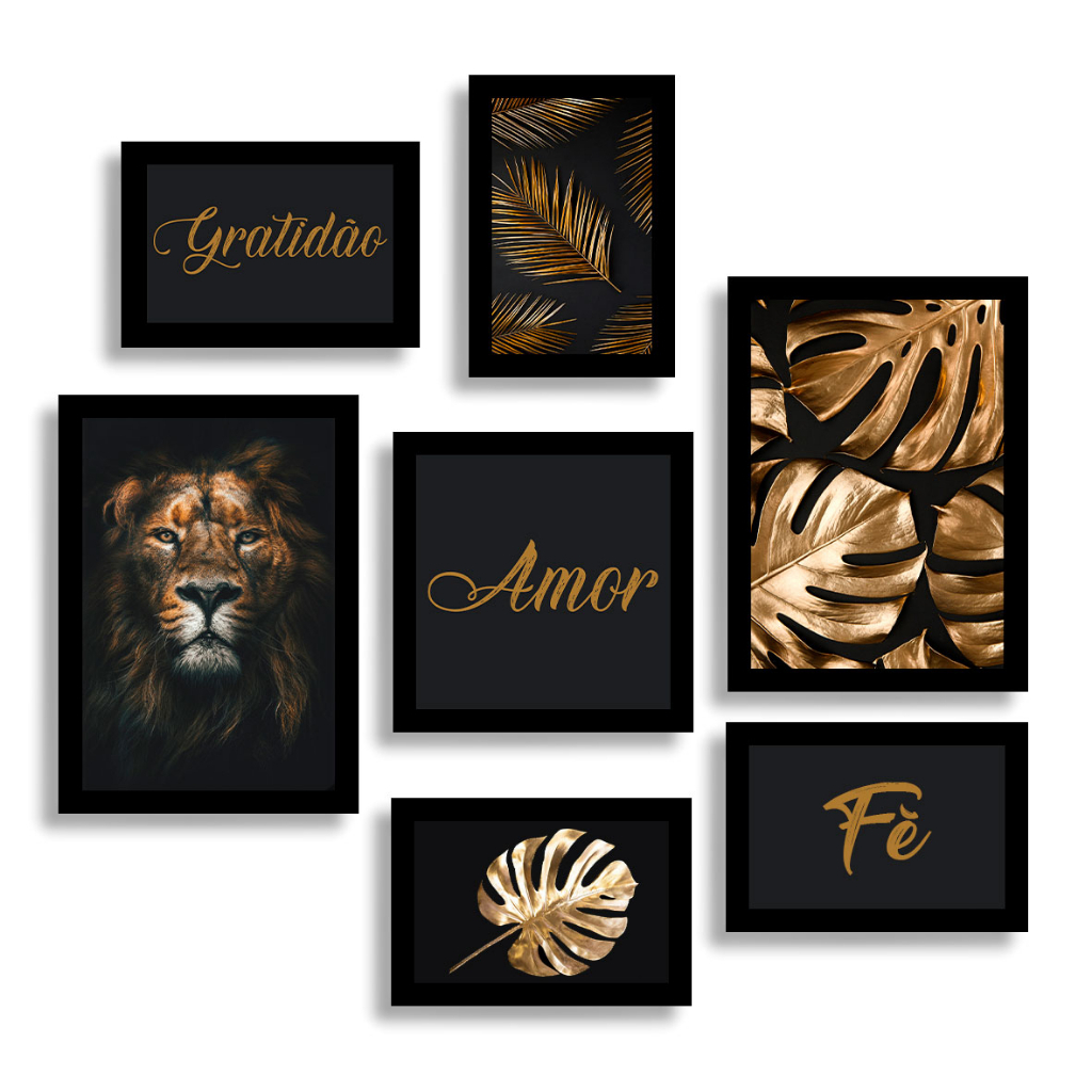 Kit 7 Placas Quadros Decorativos para sua Casa Sala Quarto Escritório Leão Folhas Douradas 60x70