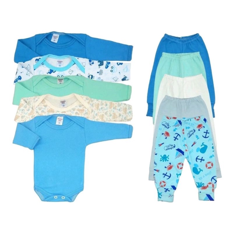 Kit 10 Peças Roupinhas de Bebê Body Longo Liso ou Estampado e Mijão