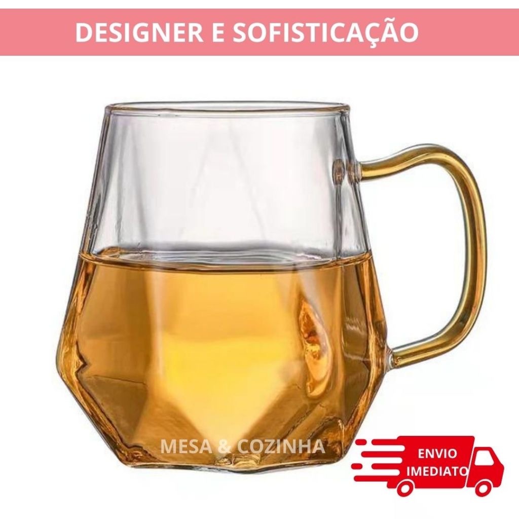 Xicara de COPO vidro JOGO COM KIT 2 UNIDADES modelo "Diamante" com alça colorida 350ml.