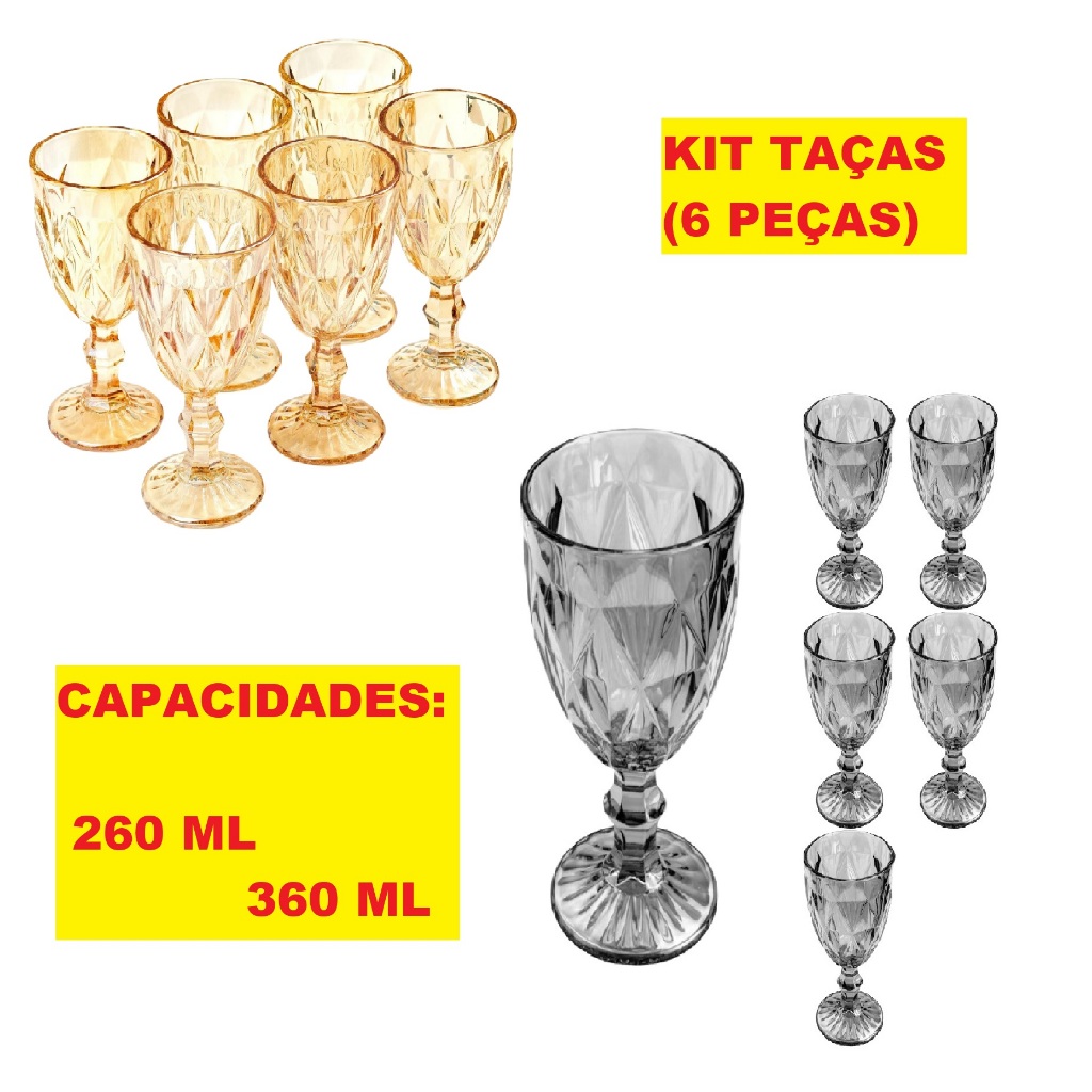 KIT 6 Peças De Taças 340ML 315ML 260ML E 50ML De Vidro Diamond Ambar E Fume Vinho Água Drinks