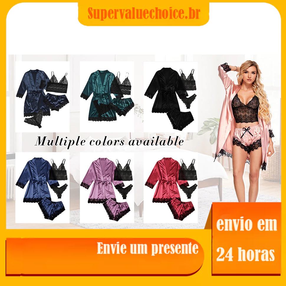 【Ganhe um presente na compra do produto 】Vestido longo Dias dos namorados Compre um e leve outro de graça Conjunto de pijama de renda de 4 peças de cetim mais vendido
