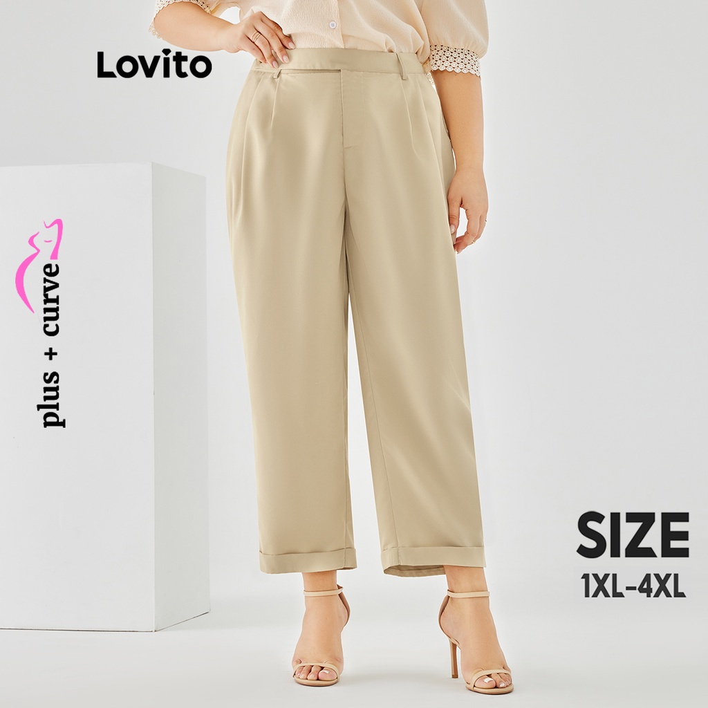 Lovito Curvas Plus Size Calça Feminina Casual Lisa Básica com Botão LPS09047 (Damasco)