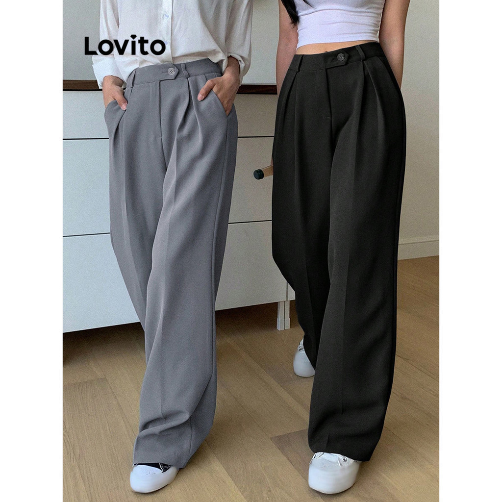 Lovito Calça casual feminina com botão de bolso e estrutura lisa LNM64183