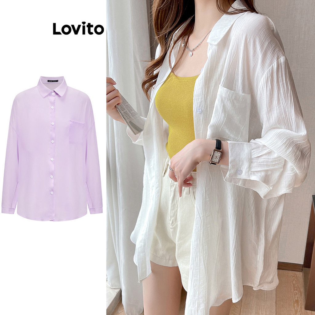 Lovito Casual Blusa Feminina Lisa com Botão e Bolso LNA14139 (Multicolorido)