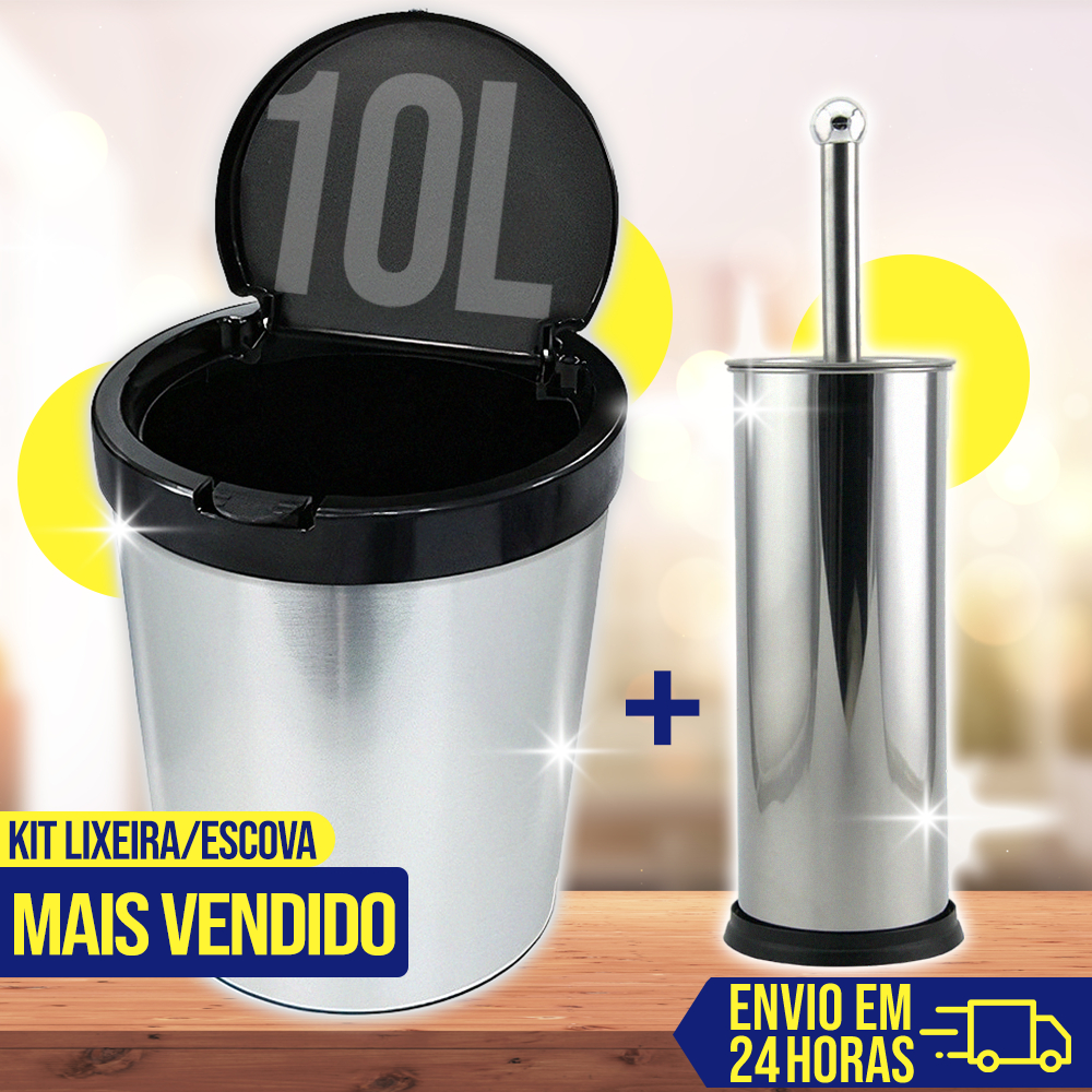 Kit Lixeira Cesto de Lixo 10 Litros / Escova Sanitária Inox Automática Tampa Click Label Para Banheiro Cozinha Escritório Quarto - Arqplast