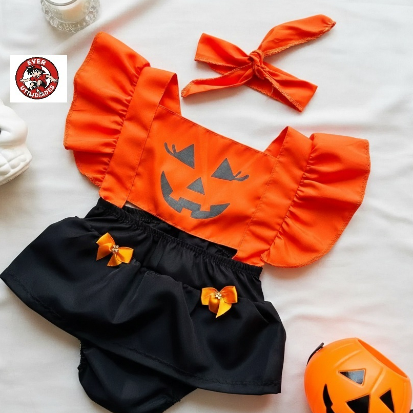 Fantasia Halloween Bebê Jardineira Romper Abóbora Morcego Wandinha + Faixa de Cabelo – 3 a 6 Meses, Mesversário e Ensaio