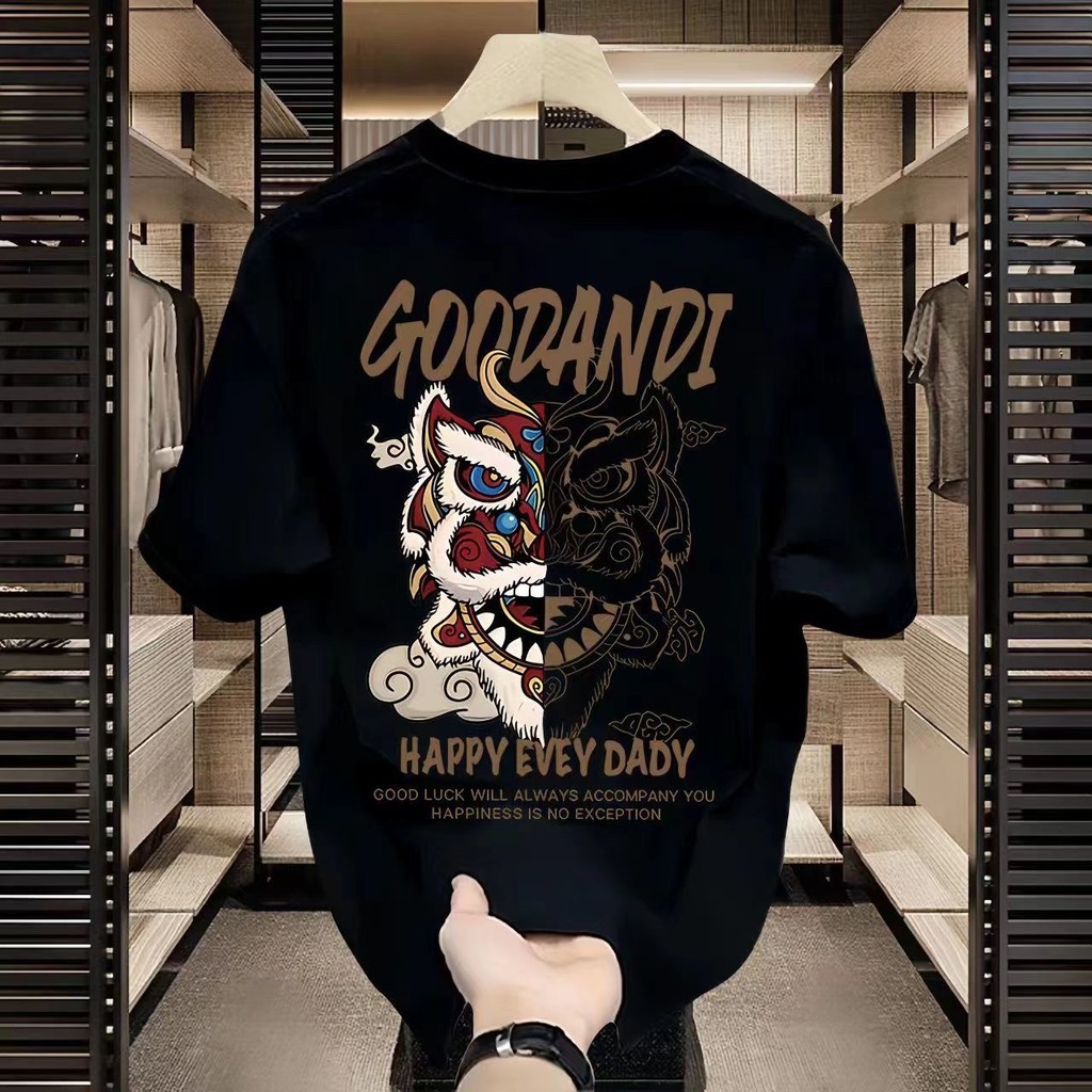 Hong Kong Style Ice Silk Summer Depicting Lion Impressão Camiseta de manga curta Homens Mulheres Camiseta de manga solta Meia manga