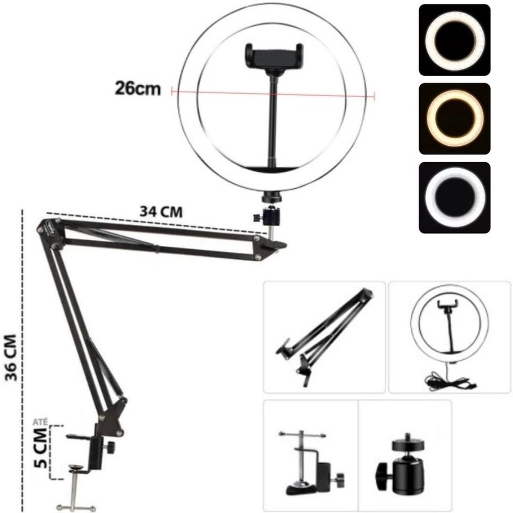 Ring Light Anel de Luz Led Grande 26cm Com Suporte Articulado de Mesa Tripé Tipo Braço Flexível Para Escritório Apoio Celular Live Vídeo Chamada Profissional