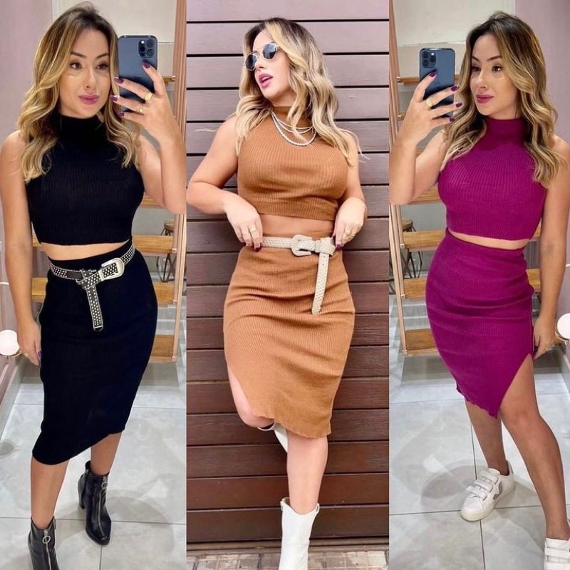Conjunto feminino canelado Virgínia saia + cropped tricot moda básica tendência tricô