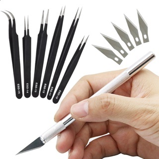 KIT Estilete De Precisão Bisturi 5 Laminas com 6 Pinças Artesanato Bijuterias