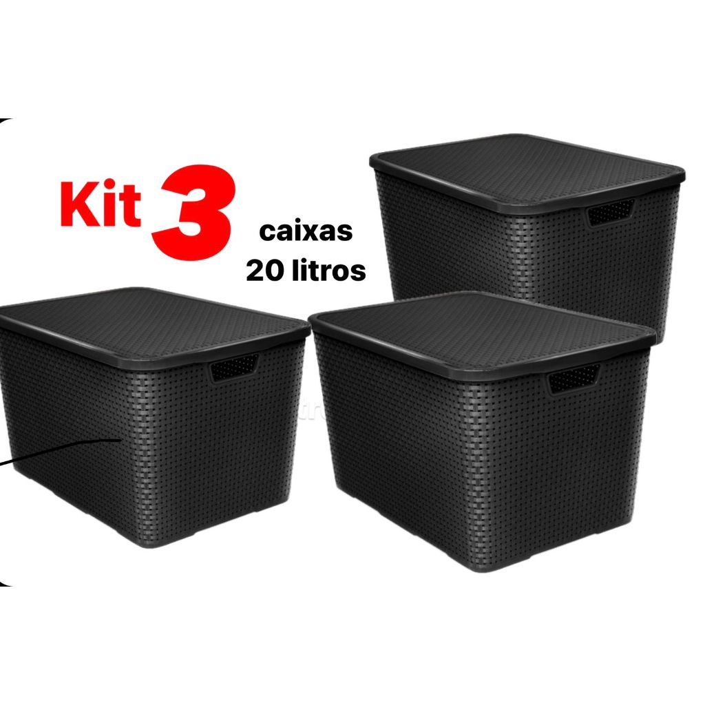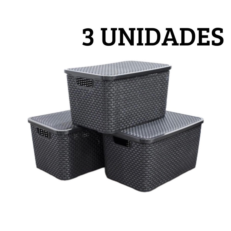 Kit 3 Caixas Organizadoras Cesto Multiuso Rattan 20 Litros Com Tampa Preto Caixa Organizadora TOY