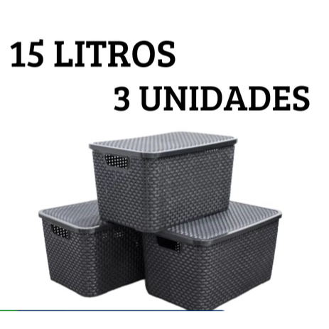 Kit 3 Caixas Organizadoras MELHOR PREÇO cesto Multiuso Rattan 15 Litros Com Tampa Preto Empilhavel toy 25593
