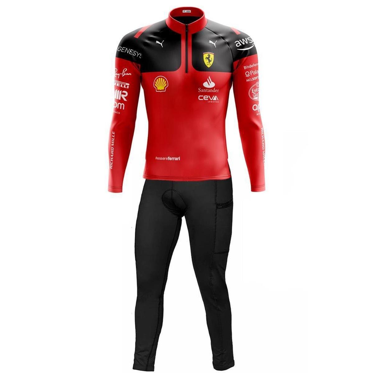 Conjunto Ciclismo Masculino Calça e Camisa Manga Longa Ferrari F1 Com Bolsos Uv 50