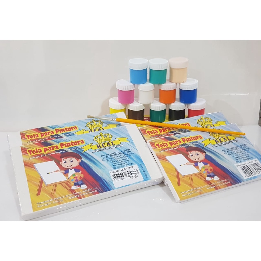 KIT PINTURA: 4 Telas para Pintura / 1 Pincel / 12 Tintas Guache