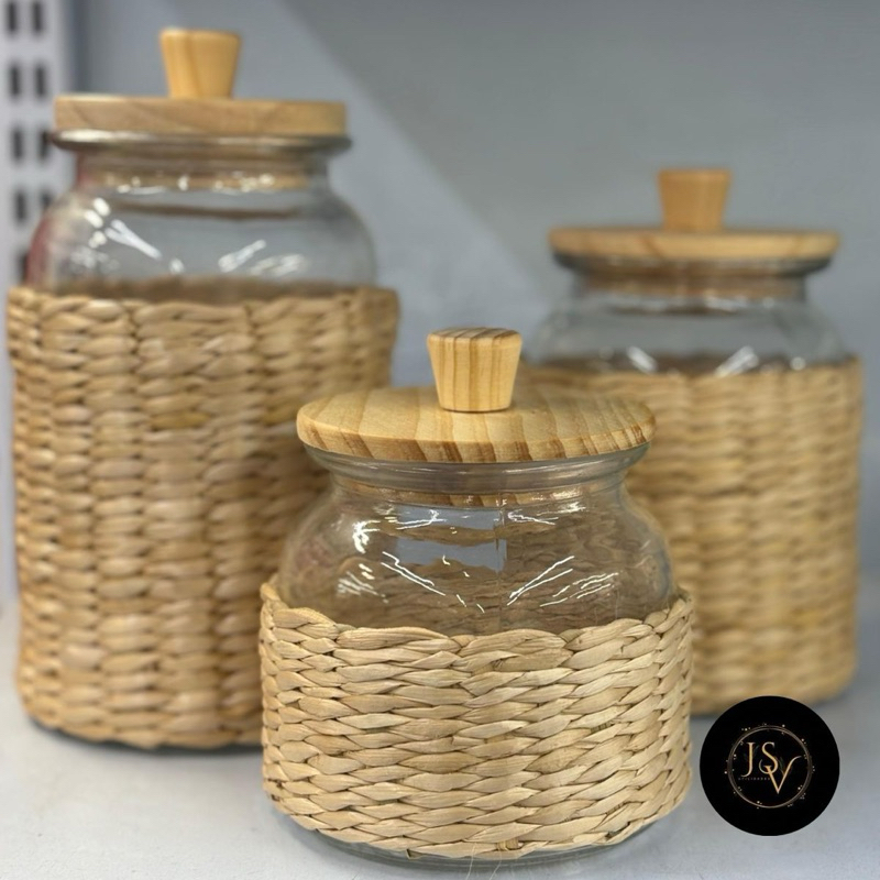 Kit com 3 Potes Herméticos Vidro + Fibra Natural + Tampa de Bambu 700ml 1L 1,3L Decorativo Rústico