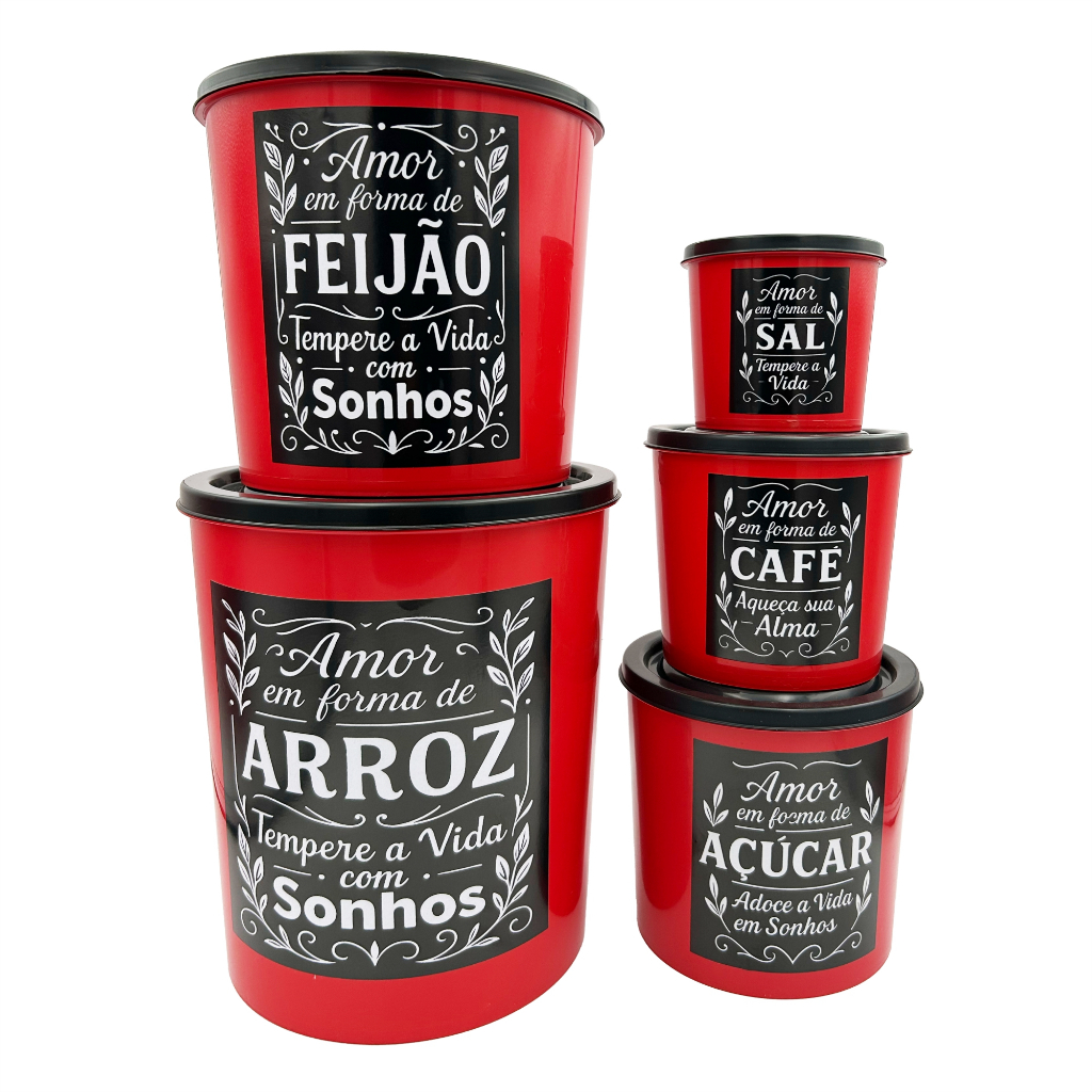 Kit Jogo de 5 Potes Mantimentos - Plástico - Resistente 5 Peças Cores Variadas Preto Branco Vermelho Rosa Amarelo Azul Tiffany Verde - Cozinha - Organizador Prático, Veda Bem, Fecha bem - Utilidades Domésticas - ARTVIDA
