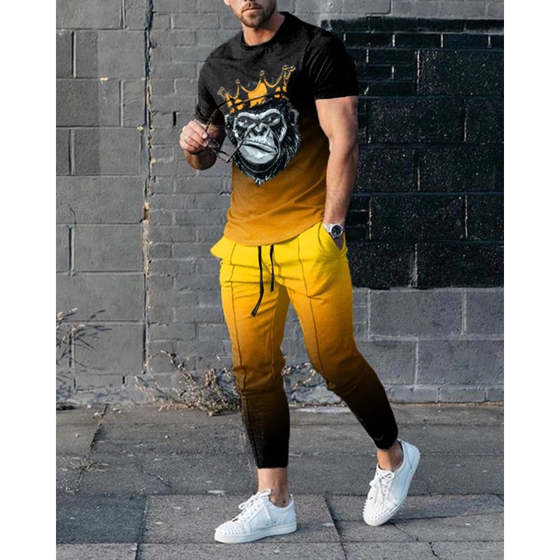 Calça Masculina Fato De Treino Para Desporto Conjunto De 2 Peças 3D Impresso De Verão Funny Monkey Smiley Camisa De Manga Curta + Comprida Roupa De Rua