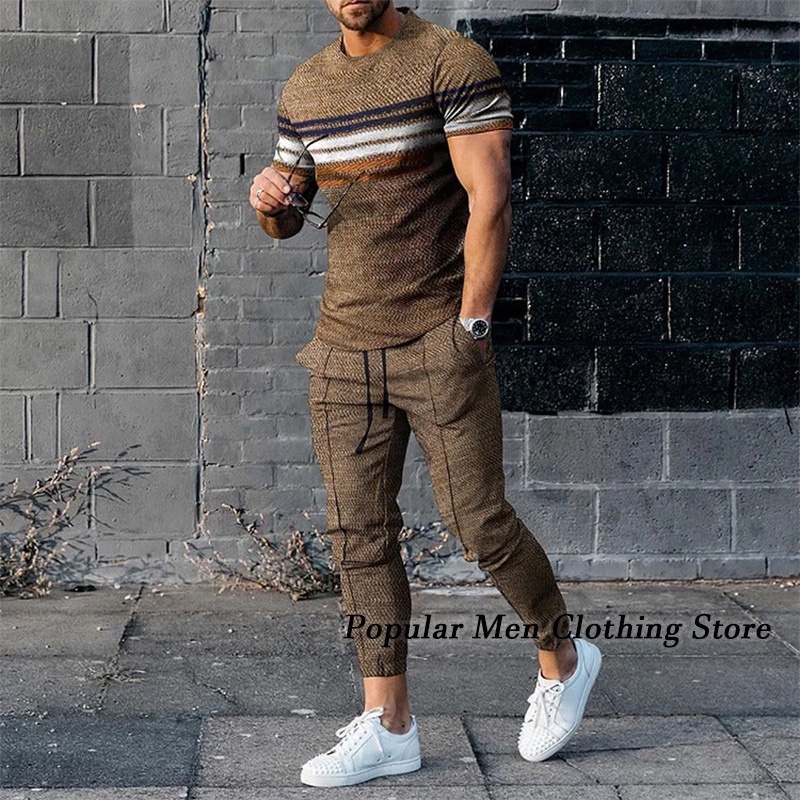 2023 Roupa Masculina Traje De Treino Manga Curta Camiseta + Calça Longa 2 Peças Conjunto De Tamanho Grande Roupas Jogger Esportiva Estampa 3D Calças