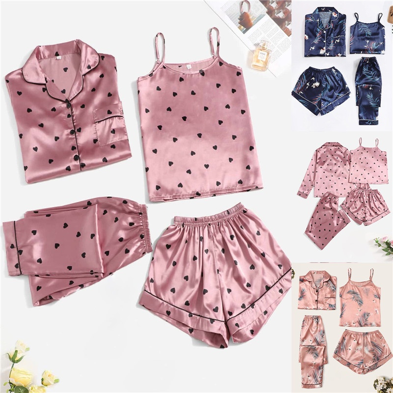Conjunto De Pijamas De Seda De 4 Peças Para Mulheres Noite sexy Usam Calções De Sexo Calça De Manga Comprida Pijama De Cetim