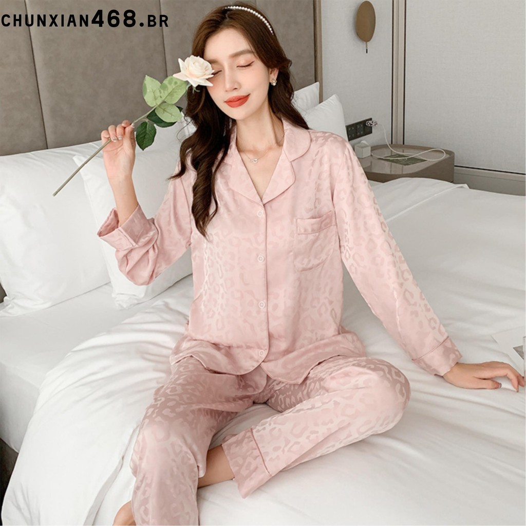 pijamas de seda gelo feminino primavera outono Plus Size manga comprida calças de manga com