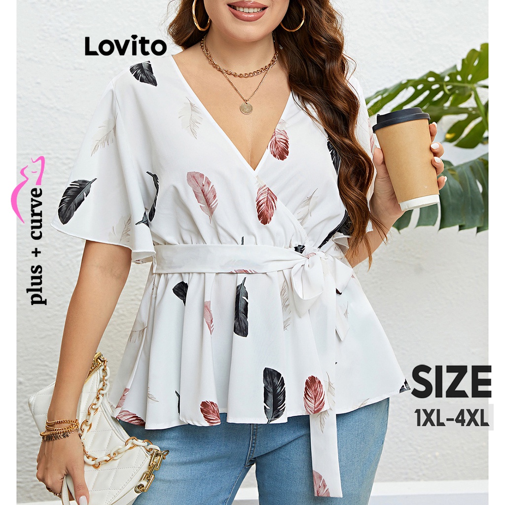 Lovito Curvas Plus Size Casual Blusa Feminina com Amarra Estampa de Pena LNL37030 (Branca)