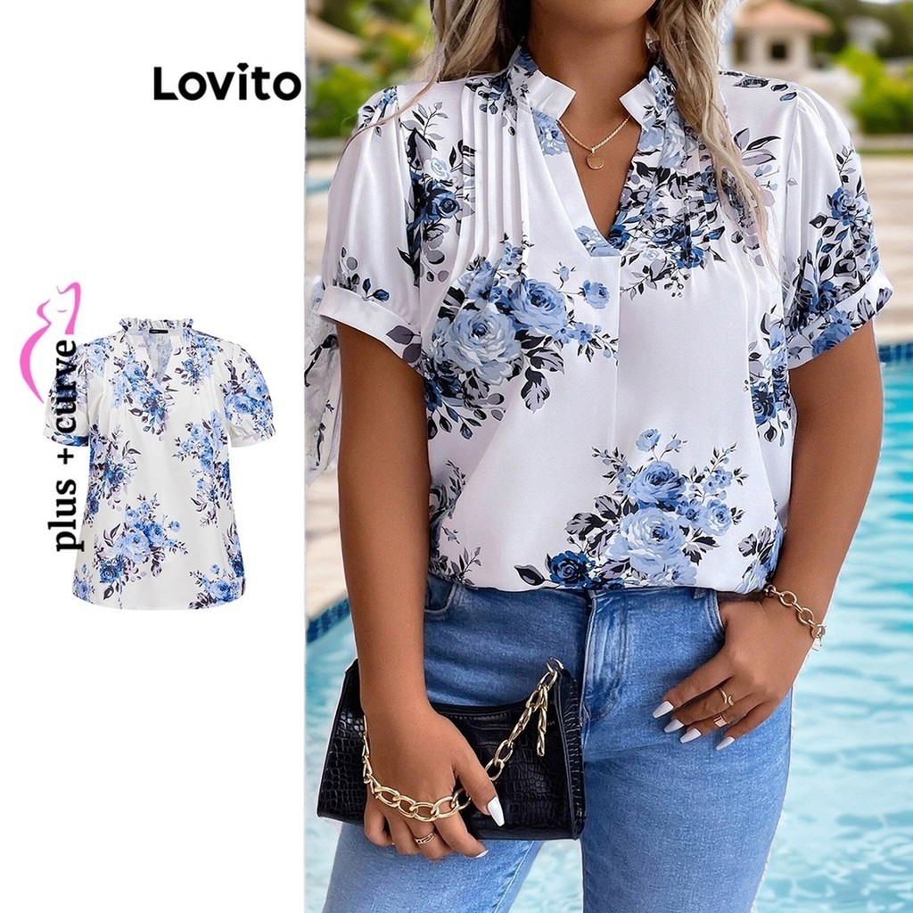 Lovito Blusa feminina casual com flores florais curvas plus size LBL20081