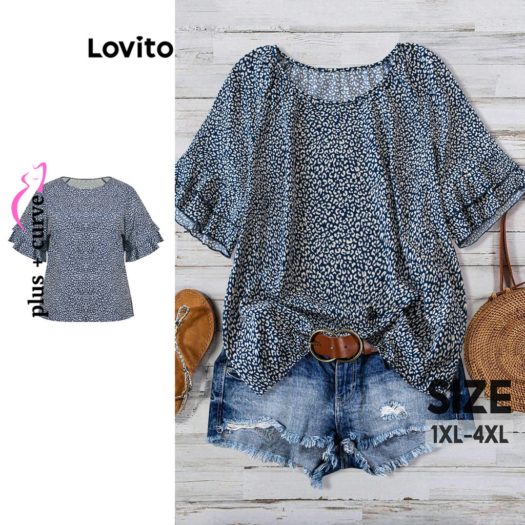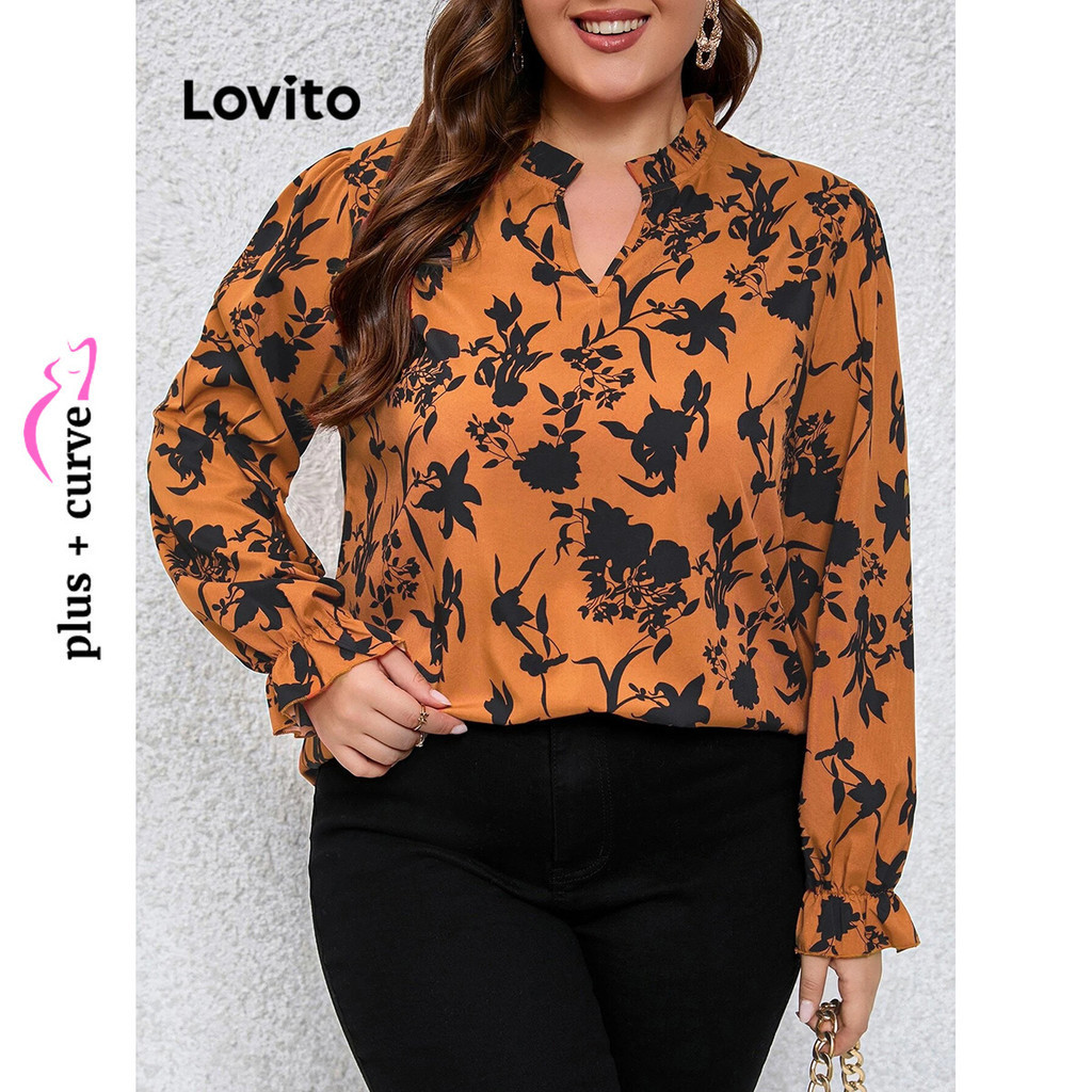 Lovito Blusa feminina casual com babados florais plus size LBL13287