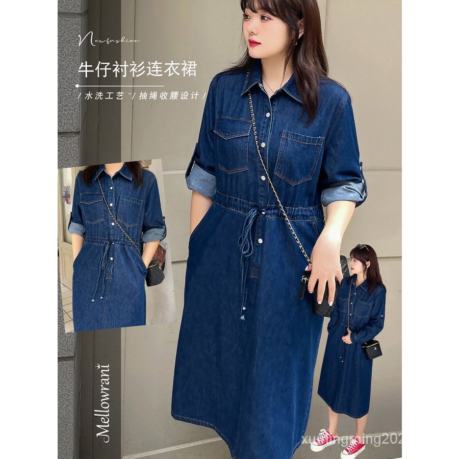 K2006 modelo de outono plus size vestido de camisa jeans feminino 200 jin vestido de deslocamento jeans macio de manga comprida gordo mm