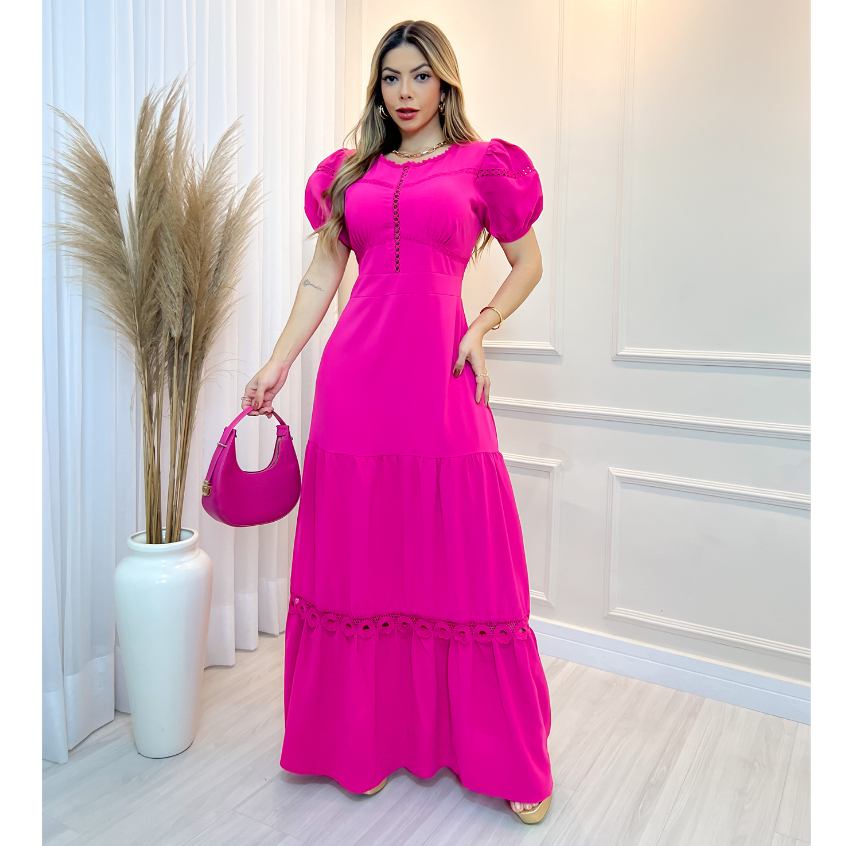 Vestido Longo Feminina Com Bojo Liso Manga Bufante Verão 3RD SD592