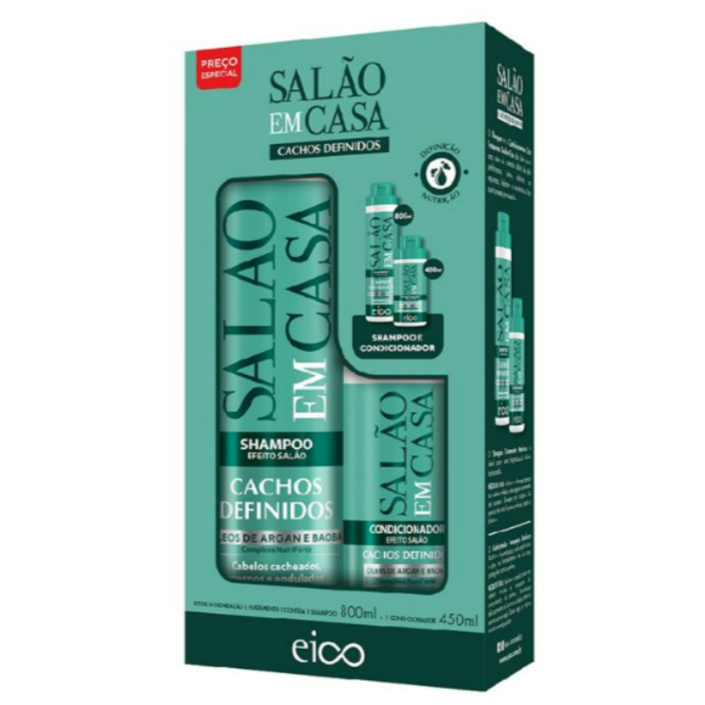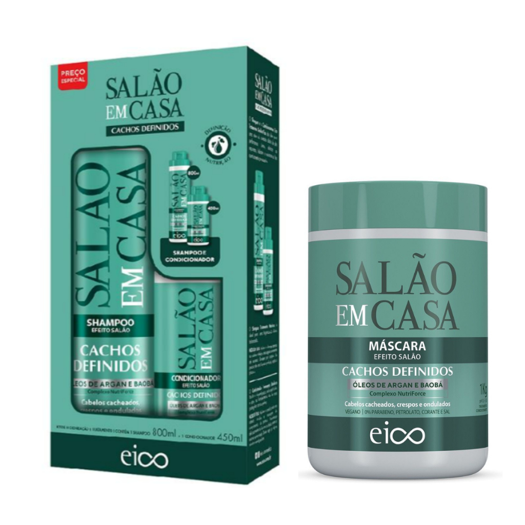 Eico Kit Shampoo 800ml e Condicionador 750ml Salão em Casa Cachos Definidos + Spray Proteção Térmica 120ml + Máscara 1Kg
