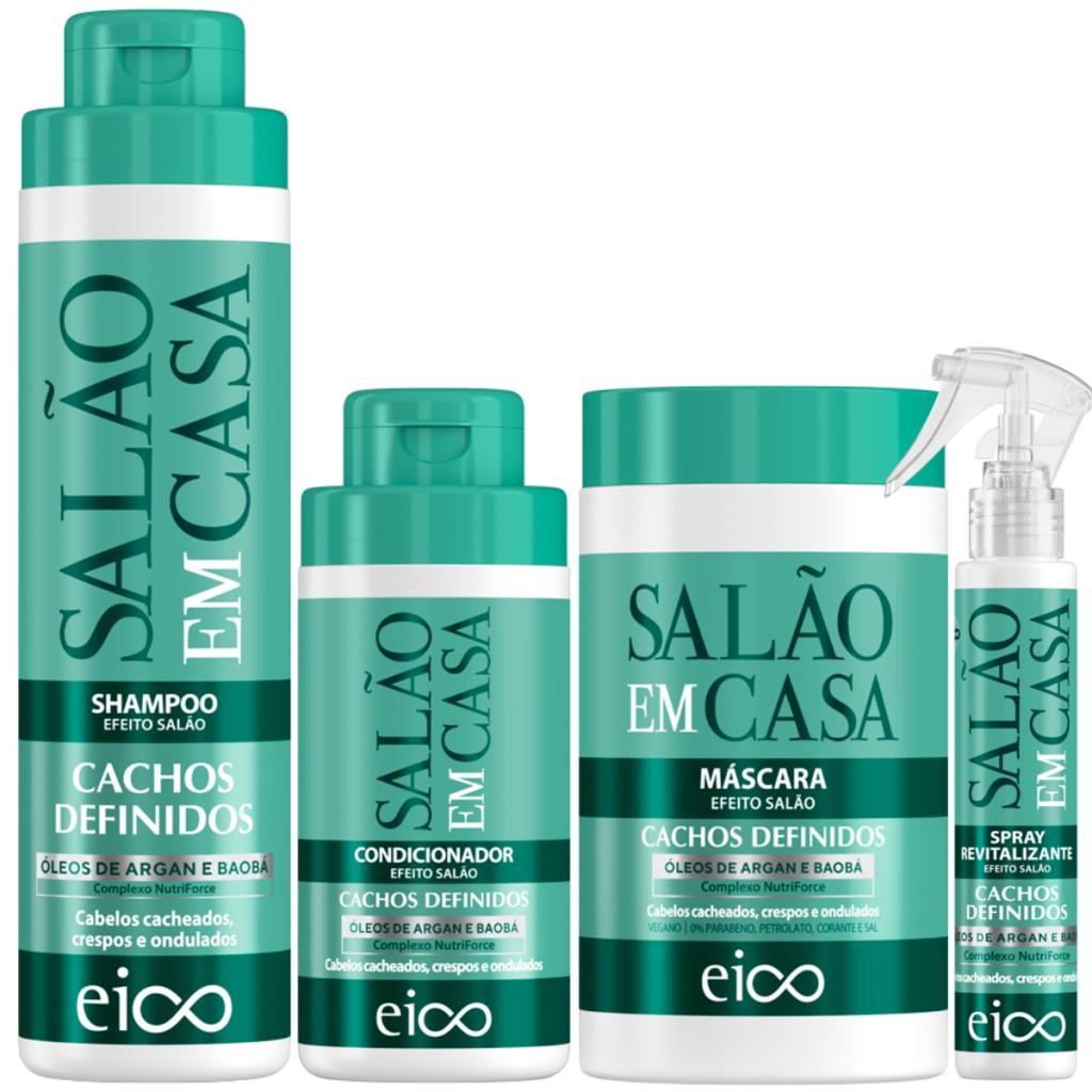 Kit Eico Salão em Casa Cachos Definidos Shampoo 800ml Condicionador 450ml Máscara 1Kg Spray 120ml