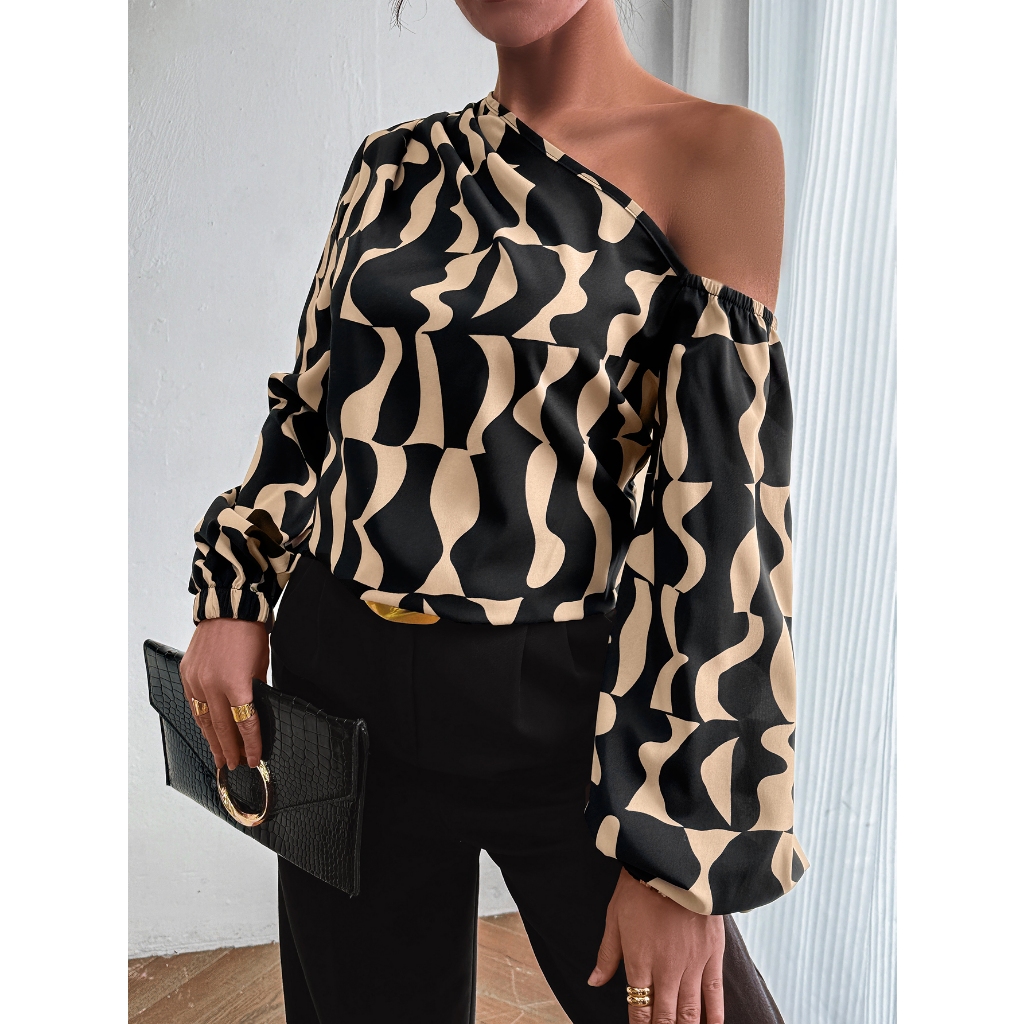 SV Blusa elegante feminina manga longa, ondulado, com padrão ondulado elegante, ombro irregular, mangas balão.