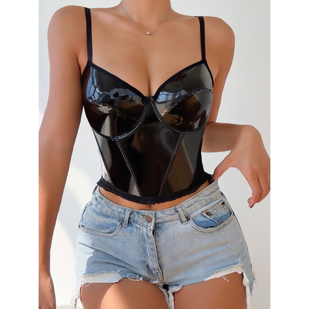 Blusa Cropped Feminino Regata Retro Couro Fake Preto Top Corset Crooped Corselet Alcinha Com Bojo